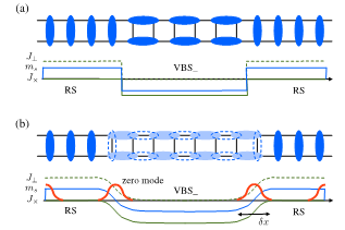 图1(a)自旋梯子量子相“异质结”示意图,RS代表“垂直”共价键晶体态,VBS_代表“负”共价键晶体态,这两个量子相中的单重态马约拉纳场具有不同的质量,在界面处交换质量符号使得我们可以“捕获”局域零能模。