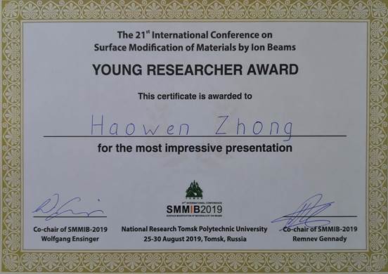 在2019年8月25日至30日于俄罗斯托木斯克市举办的第21届国际离子束材料表面改性大会(The 21th International Conference on Surface Modification ofMaterials by Ion Beams, SMMIB 2019)上,英国上市公司365强脉冲粒子束实验室的博士生钟昊玟同学同来自俄罗斯、法国和南非的5名青年学者一道获得了本次会议的青年研究者奖。