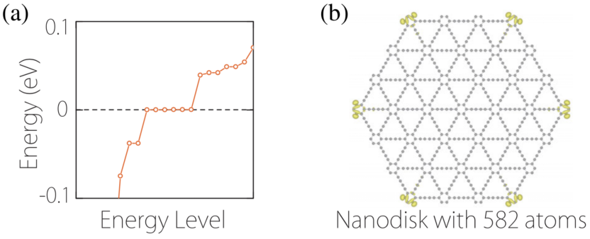 | 图1:石墨炔六角形纳米盘结构的(a)能级与(b)零能态的电荷分布。[PRL(2019)] |