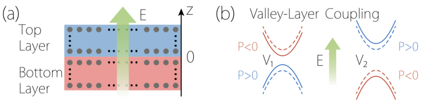| 图2:(a)双层二维材料示意图,每层都可能包含几个原子层;(b)相反谷层电极化可以通过门电压调控。[PRL(2020)] |