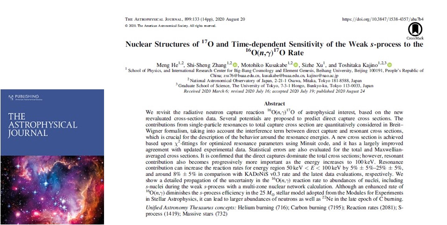 近日,国际天体物理知名期刊《The Astrophysical Journal》在线刊登了我校英国上市公司3652017级硕士研究生贺萌(第一作者)及其导师张时声副教授(通讯作者)、日下部元彦副教授、许思哲、梶野敏贵教授,在大质量恒星演化过程研究方面的最新进展:《Nuclear Structures of17O and Time-dependent Sensitivity of the Weak s-process to the16O(n,γ)17O Rate》。(论文链接:https://iopscience.iop.org/article/10.3847/1538-4357/aba7b4)