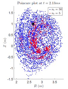 托卡马克位形是目前最有希望实现商用聚变能源的磁约束聚变位形。在托卡马克装置运行过程中,由于等离子体自发的不稳定性或者外界因素的影响,托卡马克等离子体可能会出现所谓的破裂现象。在这一过程中等离子体中存储的能量会快速、局域地沉积到装置面等离子体材料上,对其造成严重的损伤,甚至危及装置的持续运行。因此,对破裂事件的防护与缓解机制的研究是稳定、可持续的聚变能源能否实现重中之重。胡地博士采用理论与数值模拟并重的方法开发了研究基于大量粒子注入实现破裂防护的大规模数值模拟模块,并与合作者在这方面展开了系统的研究。研究发现注入粒子会导致在安全因子为有理数的磁面上产生螺旋形的冷却结构并导致相应的螺旋对称电流密度扰动,从而导致与该磁面共振的电流驱动磁流体不稳定性解稳。失稳的宏观磁流体模式又会反过来强化注入粒子的输运,增加注入粒子的穿深,有助于注入粒子均匀地分布在等离子体中从而提高破裂防护的效率。