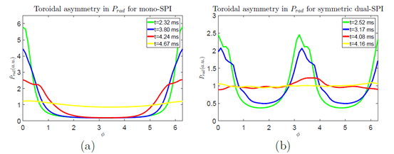 针对破裂热猝灭期间的热流防护效率问题。胡地博士发现多环向位置同时粒子注入能够在较为合理的参数区间内有效地提高注入杂质粒子辐射功率密度的均匀性,从而避免辐射能流在装置壁上局域的沉积效果,显著提高破裂防护效率。同时,多位置同时诸如下注入粒子与磁流体模式的相互作用也体现出与单一位置注入时不同的对称特征。近日,上述成果以“Radiation asymmetry and MHD destabilization during the thermal quench after impurity Shattered Pellet Injection”为题发表在Nuclear Fusion上,相关系列工作也已于今年分别发表在Nuclear Fusion与Physics of Plasmas上。该系列研究对完善托卡马克等离子体中的破裂防护机制、保证托卡马克装置长期、稳定运行有重要意义。相关工作得到了国家自然科学基金委支持。