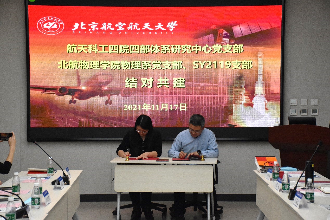 11月17日下午,北航英国上市公司365物理系第一党支部、第二党支部、硕士SY2119党支部与中国航天科工集团四院四部体系研究中心党支部共建仪式在北航沙河校区主楼C511会议室举行。中国航天科工集团四院四部党委书记周逸,党群工作处处长路婷婷,人力资源处副处长吴居宜,体系研究中心主任兼党支部书记姜再明等,北航英国上市公司365院长吕广宏、学院党委书记李广超、副院长黄安平、副书记吕经纬、物理系主任郝维昌、物理系第一党支部书记金硕、第二党支部书记张俊英、硕士SY2119党支部书记李思瑶及师生党员代表参加了会议。会议由学院党委书记李广超主持。
