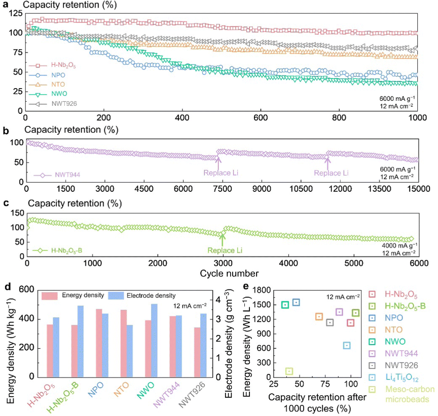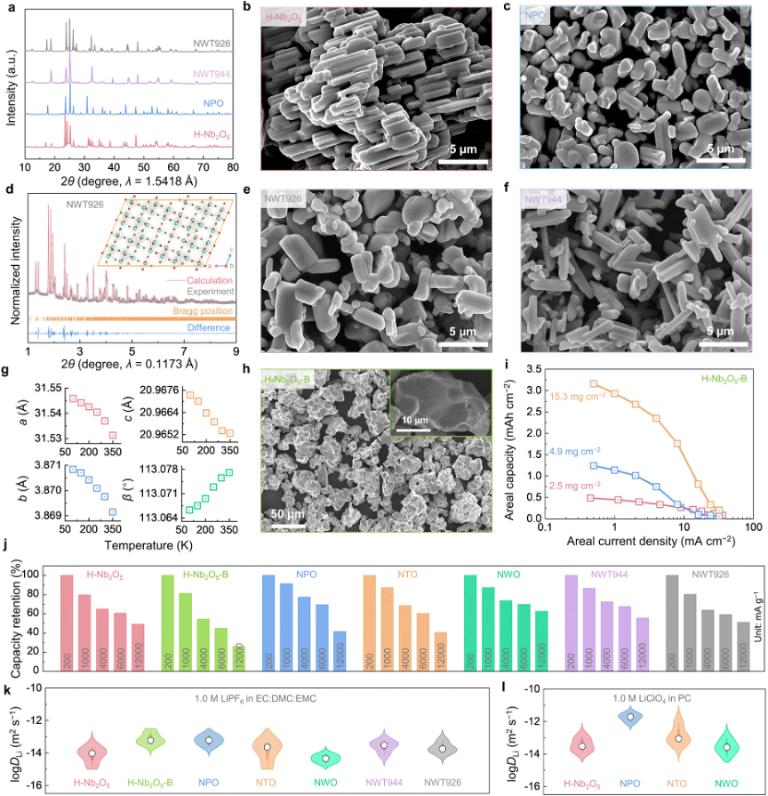 本研究中作者首先定义了“前沸石框架结构”,即孔道直径小于H2O分子的致密晶体材料。因为这类结构排除了水分子和一般小分子的嵌入或吸收,同时允许锂离子在晶格内像表面扩散一样的快速迁移,有望使得这类结构同时满足高致密度及高功率的电化学性能。与锂离子嵌入型化合物不同,这类前沸石框架结构中由于较低的原子拓扑约束和较大的宿主自由体积会导致异常的热膨胀(低/负的热膨胀系数)和软声子特性,这也导致了块体晶格中类表面扩散机理的出现。接下来作者给出了这种前沸石框架结构的设计方法:其材料的孔道直径在2.5~2.8 埃,阴离子与阳离子比约为2.5,包含但不限于Nb、W、Ti等元素的氧化物。最后作者将上述设计方法应用于NbO2.5-WO3-TiO2三元相图,并成功合成了一系列微米级高致密度及高功率的电极单晶材料。其中包括两种新物相材料:Nb9W2Ti6O40.5和 Nb9W4Ti4O42.5,它们以高电极密度(3.2~3.3 g/cm3)、高容量(1C下约200 mAh/g1)、高功率(60C下约60%的容量保持率)和长循环寿命(15000次深度循环后容量保持率为56%)的优异性能,胜于绝大部分现有的高功率电极材料。此外,作者还成功合成了大于20 μm的超大单晶,仍可保持高于30 C的大功率充放电,使得这类材料在保证高体积能量密度和高循环稳定性的基础上,具有和燃油车加油相媲美的快速充电体验。