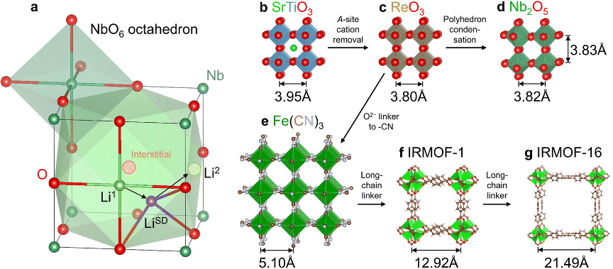 高功率锂离子电池在大型运输、工业设备和电网调节等领域发挥着重要的作用,其关键部件是电池电极材料。理想的电极材料是一种激活能小于250 meV的超快离子和电子混合导体(super-MIEC),这使得约10 μm的致密单晶颗粒的商业化成为可能(这样的大单晶颗粒可提高电池的体积能量密度并抑制电池的副反应)。在所有满足小于250 meV扩散势垒的材料中,具有离子晶格内扩散的材料很少见,但具有离子表面扩散的材料较常见。离子表面扩散的材料通常具有孔径大于2 埃的框架结构,这种框架结构的材料包括沸石(孔径为3~10埃)、普鲁士蓝和金属有机框架等纳米多孔材料,这些材料可以吸收大量的H2O分子(直径2.8埃),H2分子和CO2分子等。虽然这些纳米多孔框架结构具有极高的离子扩散率,但由于其孔径过大,无法存储过多的碱金属原子,因此无法作为高致密度的电极材料。