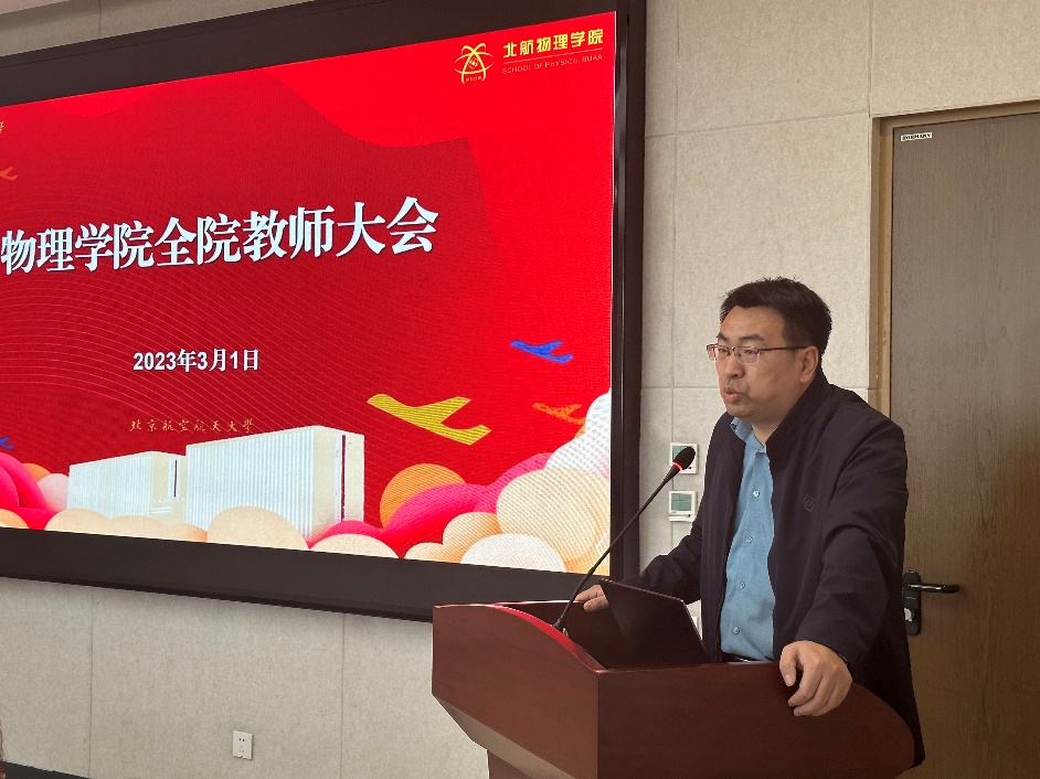 吕广宏院长传达了学校2023年度工作会暨第九届教职工代表大会第四次会议精神,全面解读了会议要点,对学院2023年重点工作做出部署。他指出,学院要更加突出内涵式发展,要把物理学科建设作为发展根基,完善学科体系,强化平台能力建设,统筹学科资源配置,强化自由探索和有组织科研的结合。要加强人才队伍建设,推动师资队伍高素质发展,鼓励青年人才挑梁担纲。要持续优化课程体系、课程团队和课程质量,进一步发挥学科负责人的作用。