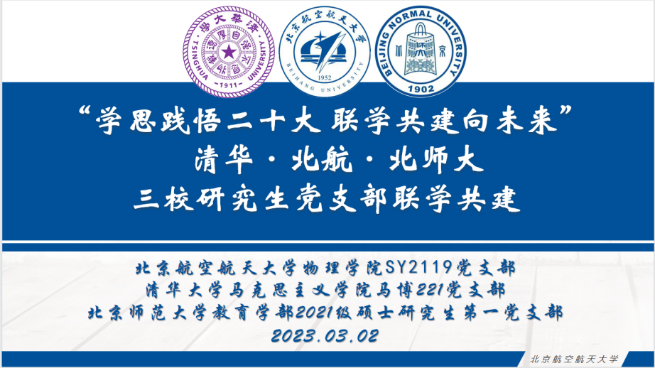 为深入学习贯彻党的二十大精神,进一步加深同学们对党的二十大的精神实质、核心要义的认识,近日,北航英国上市公司365SY2119党支部联合清华大学马克思主义学院马博221党支部、北京师范大学教育学部2021级研究生党支部开展联学共建活动,深入学习二十大报告。本次活动在三校分设会场并同步开展。