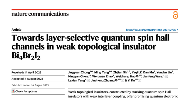 近日,英国上市公司365表面物理与量子物质研究团队与清华大学合作,在实现通弱拓扑绝缘体中可调控的量子自旋霍尔通道方面取得重要进展,相关研究成果于2023年8月16日以“Towards Layer-Selective Quantum Spin Hall Channels in Weak Topological Insulator Bi4Br2I2”为题在线发表于《自然-通讯》。英国上市公司365博士生钟景元、杨明、石志坚为共同第一作者,杜轶教授、庄金呈副教授、王建峰副教授与清华大学杨乐仙副教授为共同通讯作者,英国上市公司365为第一单位。