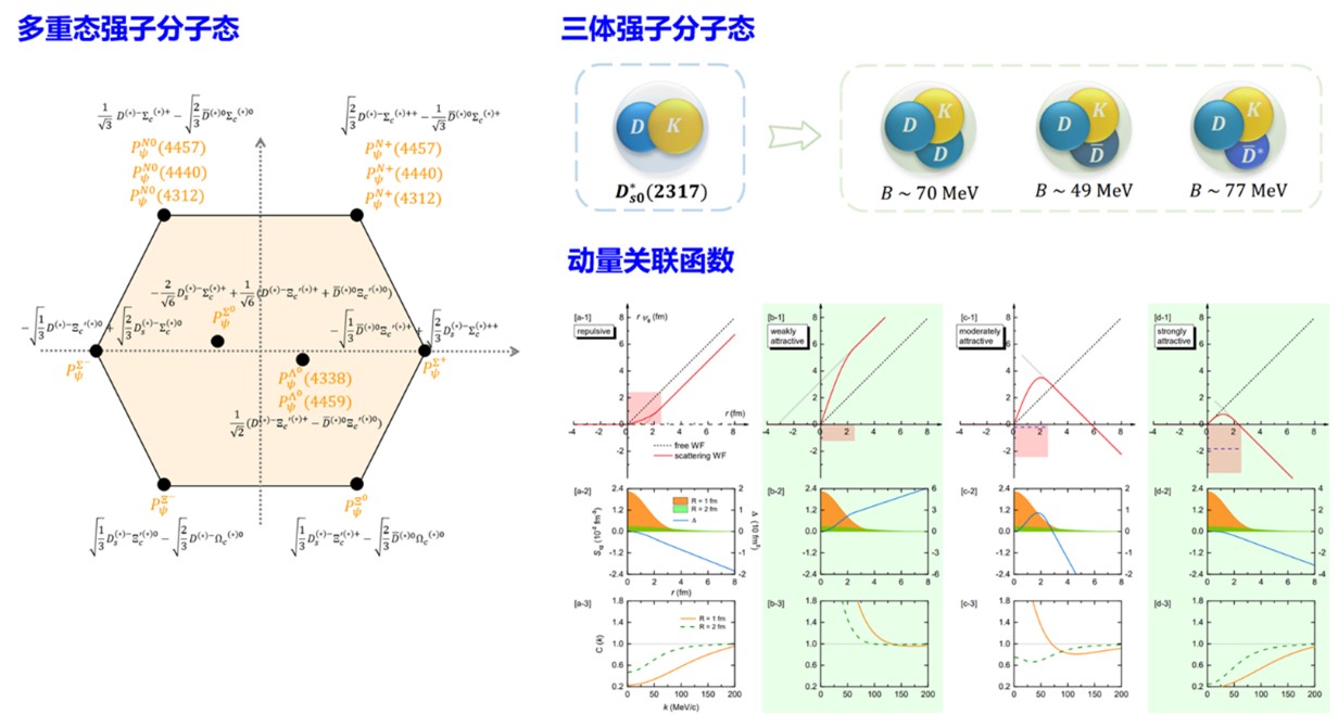 1964年,美国物理学家默里·盖尔曼和乔治·茨威格分别独立提出了夸克模型,成功解释了当时实验上发现的所有强子。根据夸克模型,强子可以分为由正反夸克组成的介子或由三个夸克组成的重子。该理论取得了巨大的成功,盖尔曼因此获得了1969年的诺贝尔物理学奖。然而,自2003年以来,实验上发现了一系列不同于传统介子或重子的新强子态,如X(3872)、Ds0* (2317)、Zc (3900)、Pc (4312)、Pc (4440)、Pc (4457)、X(6900)等。这些发现对传统夸克模型提出了挑战,同时也为深入研究强相互作用提供了新的机遇。绝大多数新强子态位于一对传统强子的质量阈值附近,因此是强子分子态的可能候选者。最常见的强子分子态是原子核及超核,通常被认为是由核子(质子、中子)及超子(如Λ超子)在核力作用下形成的弱束缚体系。