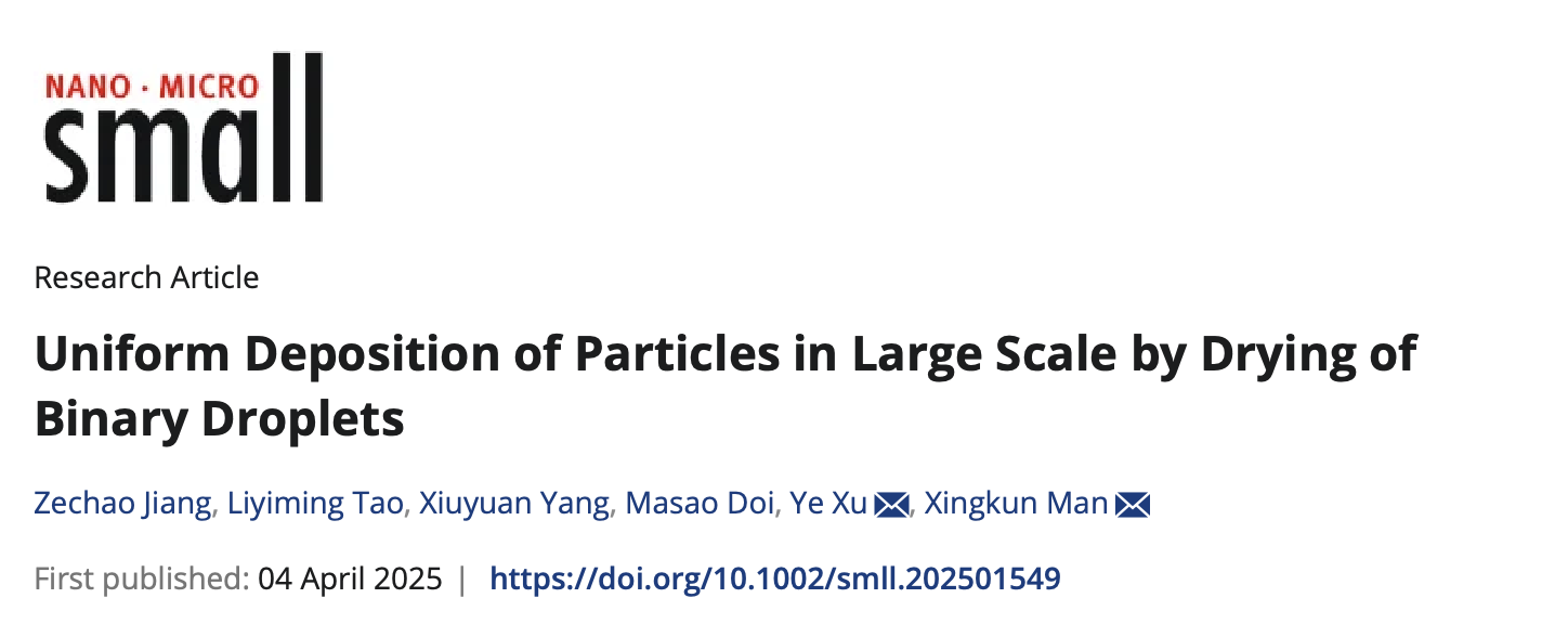 近日,英国上市公司365满兴坤教授课题组与机械工程及自动化学院徐晔教授课题组等合作,在实现大面积可控均匀沉积领域取得了重要研究成果。相关成果以“Uniform deposition of particles in large scale by drying of binary droplets”为题发表在期刊《Small》上。英国上市公司365博士研究生姜泽超和机械工程及自动化学院博士研究生陶郦祎铭为共同第一作者,满兴坤教授和徐晔教授为共同通讯作者。