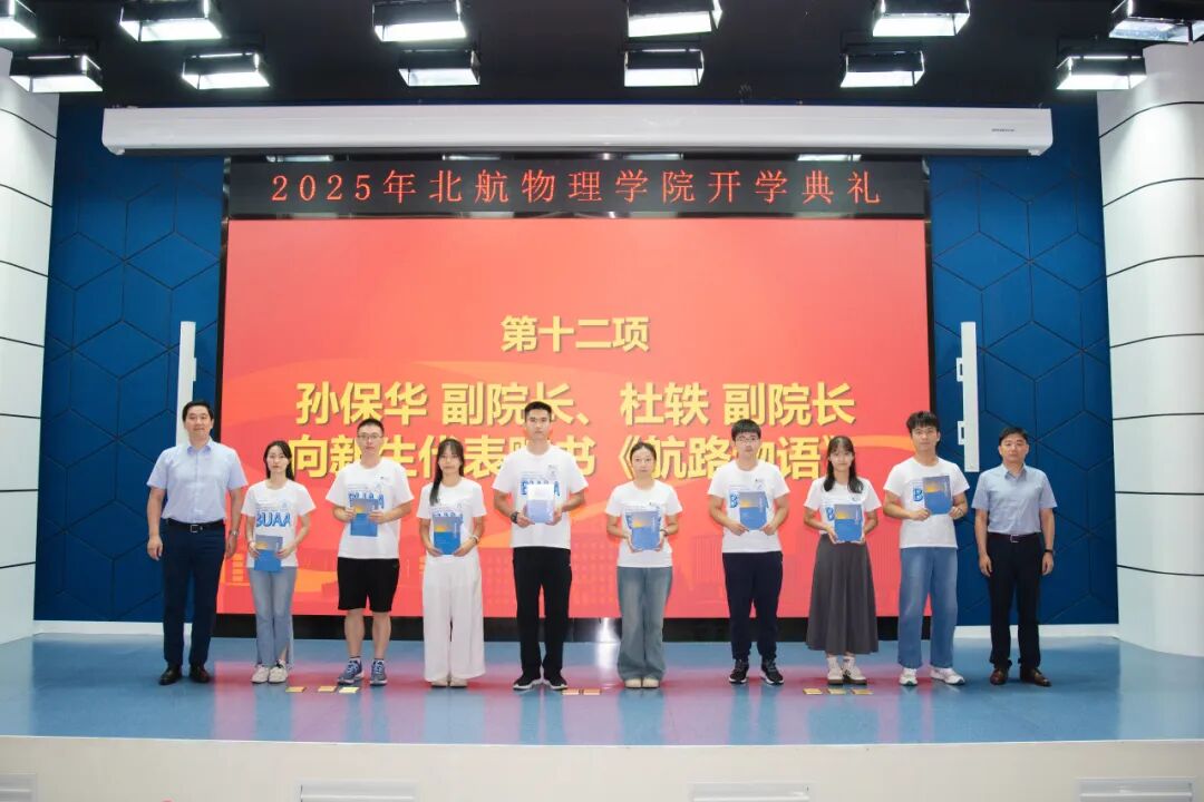 典礼最后,孙保华副院长和杜轶副院长向新生代表赠书《航路物语》,勉励同学们从中深刻体会北航物理的精神文化,不断汲取奋斗动力,在字里行间的星光与烽烟里,读懂北航物理人的执着、纯粹与信仰坐标,用新一代北航物理人的接续奋斗,为《航路物语》续写更加壮阔的下一章。