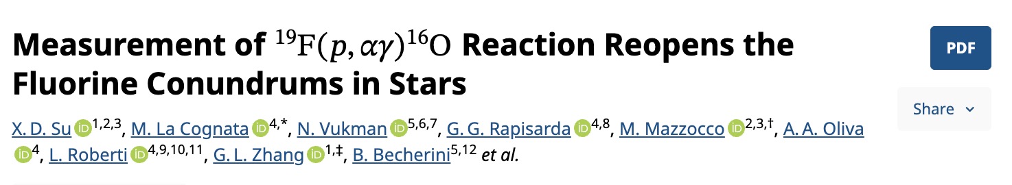 相关研究成果已于10月29日被物理学期刊《Physical Review Letters》在线发表,文章标题为《Measurement of 19F(p, αγ)16O reaction reopens the fluorine conundrums in stars》(文章链接: https://journals.aps.org/prl/abstract/10.1103/cq71-jy7s)。