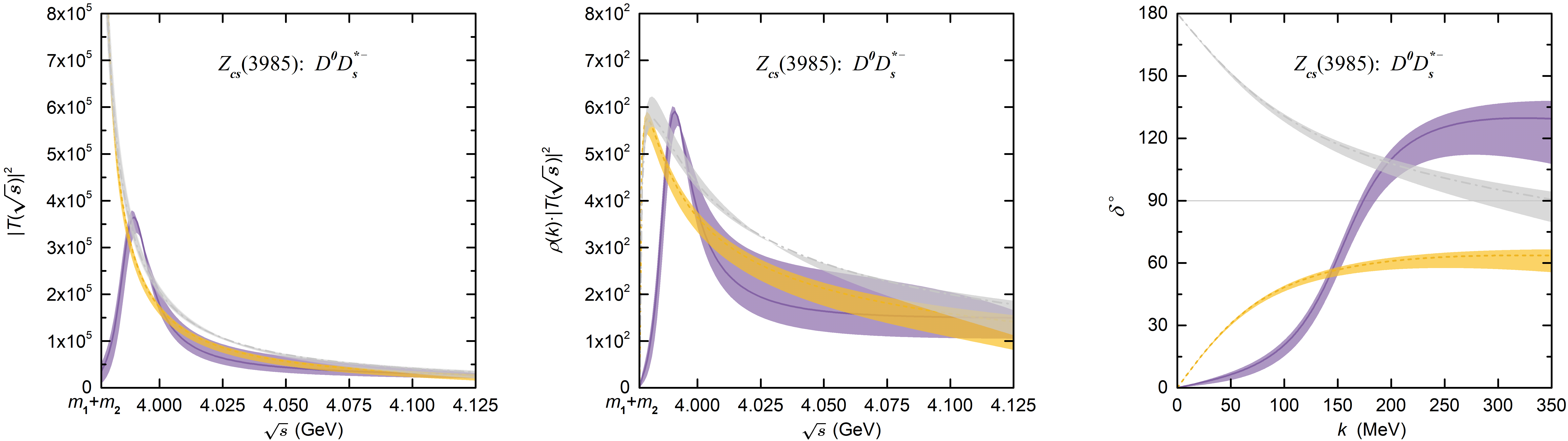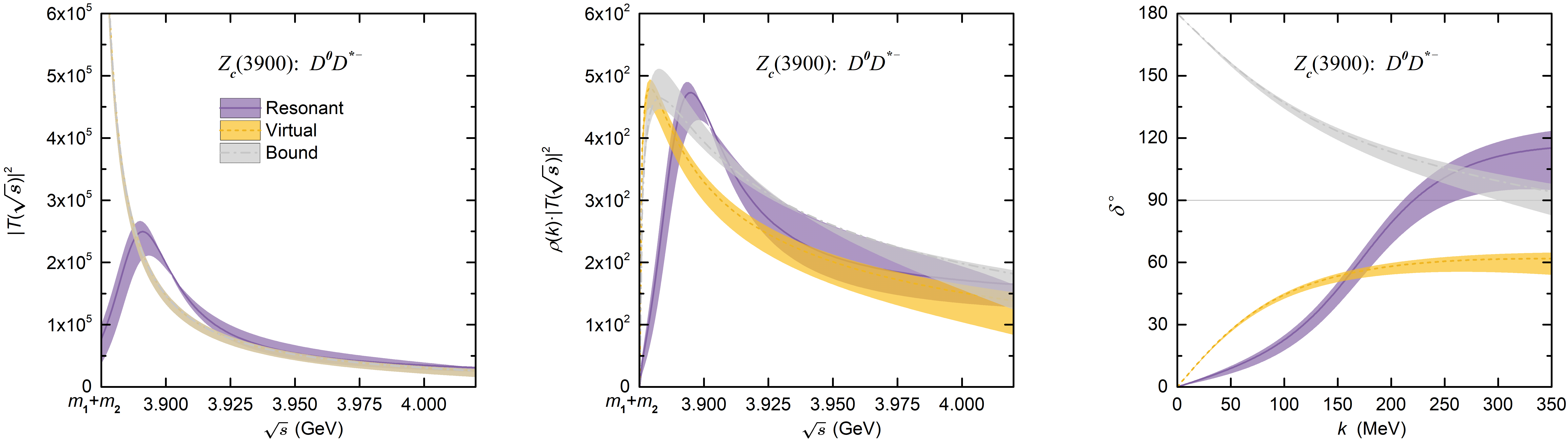 图1:展示了在共振态、虚态和束缚态三种情况下,D0D∗−(上)与D0Ds∗−(下)的散射T矩阵、不变质量谱和散射相移随能量或动量的变化。
