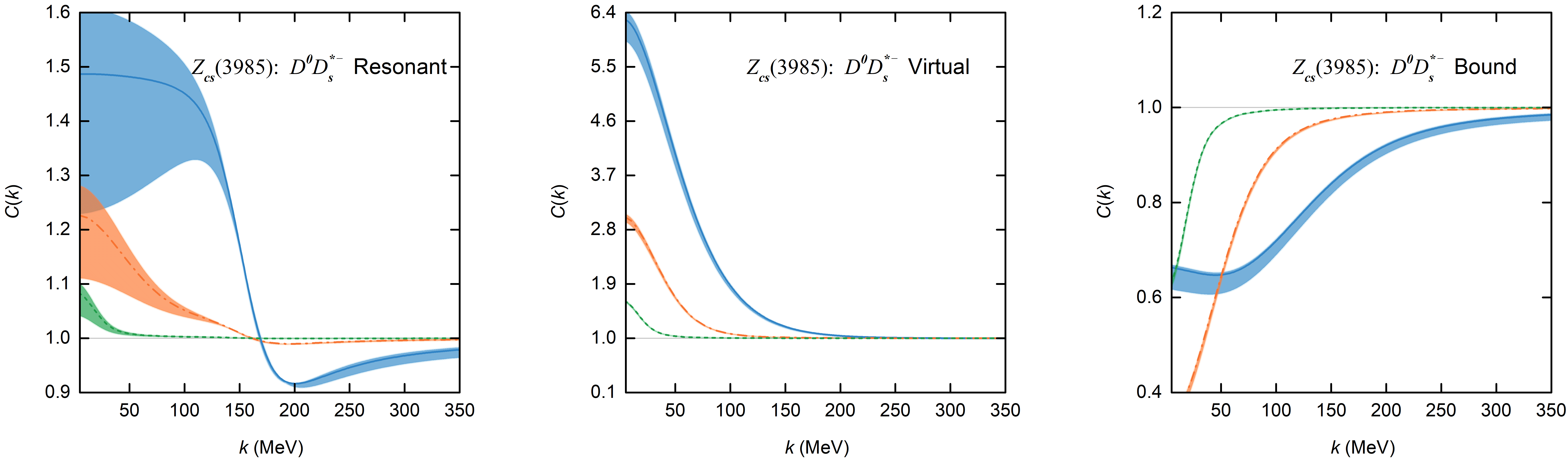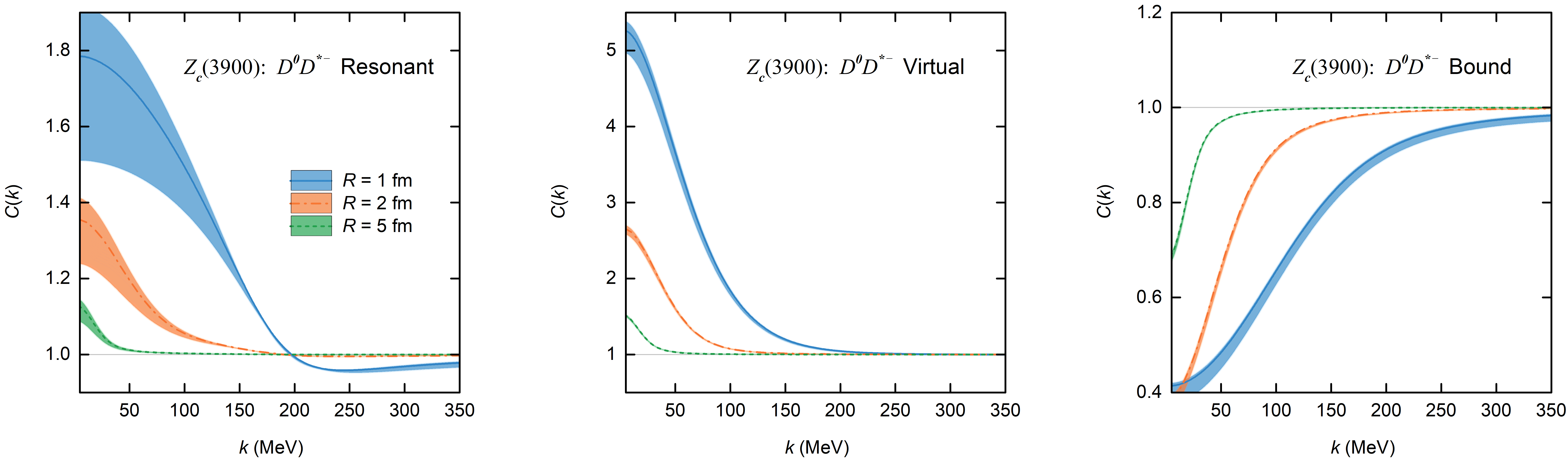 图2:比较了在不同源尺寸和三种物理情形下,D0D∗−(上)与D0Ds∗− (下)动量关联函数随相对动量的变化。