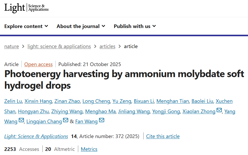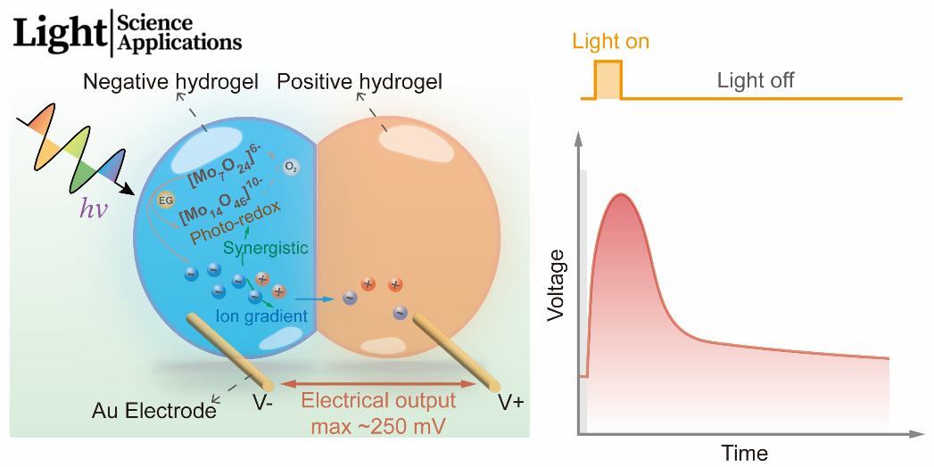 近日,北航英国上市公司365纳米光子学实验室的王帆教授与钟晓岚教授科研团队,在基于电子-离子调控的能量转化领域取得重要进展,相关研究成果以“Photoenergy harvesting by ammonium molybdate soft hydrogel drops”为题,发表于《Light: Science & Applications》上。英国上市公司365博士生卢泽霖为该论文的第一作者,钟晓岚教授、王帆教授以及生物与医学工程学院的王杨副教授、常凌乾教授为该论文的通讯作者。